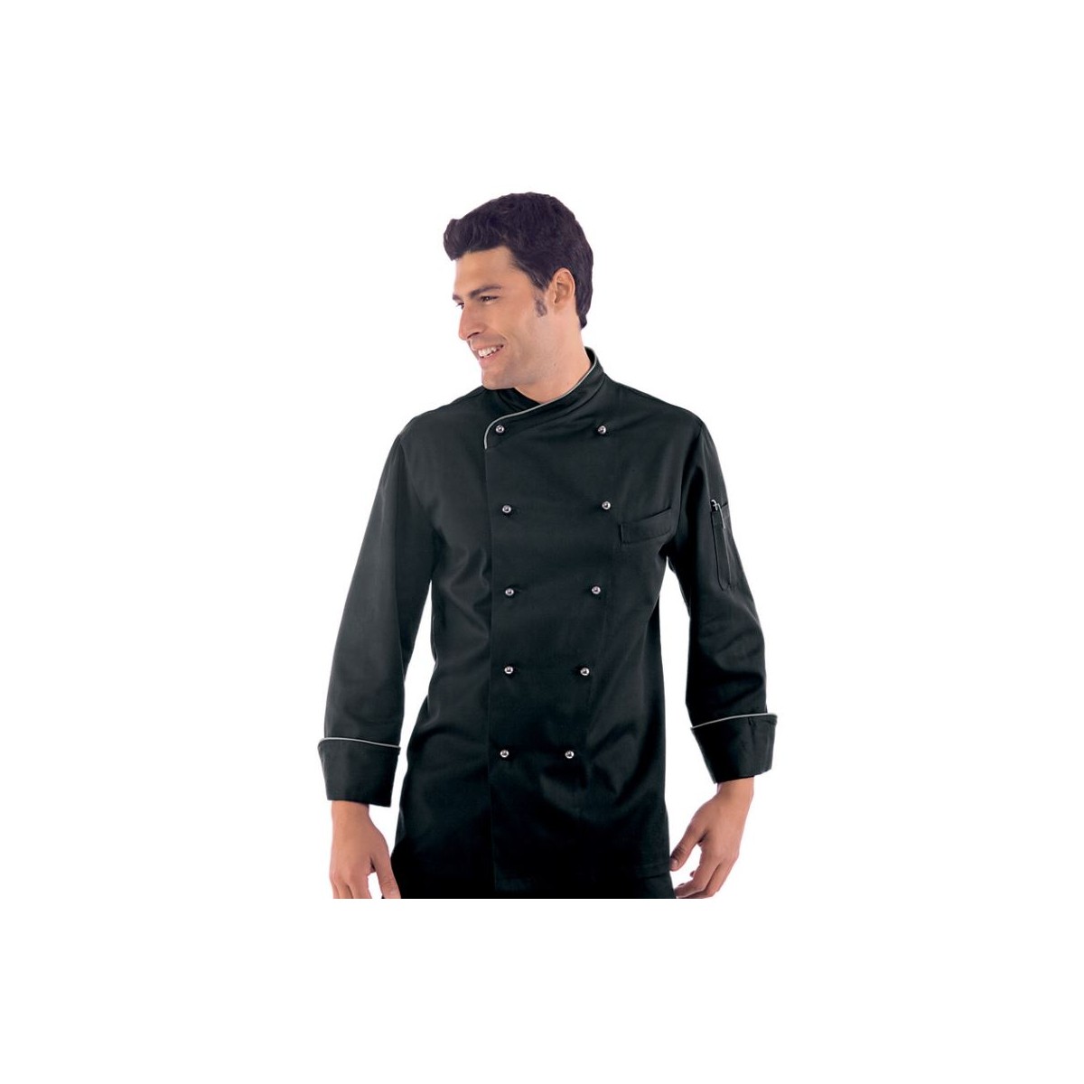 Giacca da cuoco in colore nero realizzata con tessuto 65% poliestere e 35% cotone. La grammatura è di 195 gr/m2, ed è disponibile in tutte le taglie.