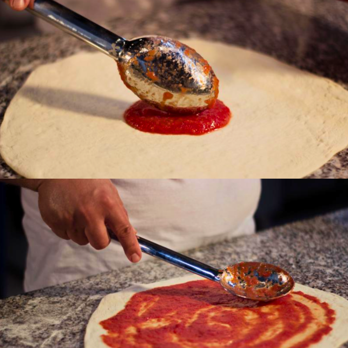 Cucchiaio in acciaio inox, lunghezza 32cm, capacità 53gr adatto per il condimento della pizza col pomodoro, capacità 53 grammi.La parte inferiore del cucchiaio è studiata per facilitare il movimento circolare tipico del pizzaiolo nel condire ed espandere il pomodoro.