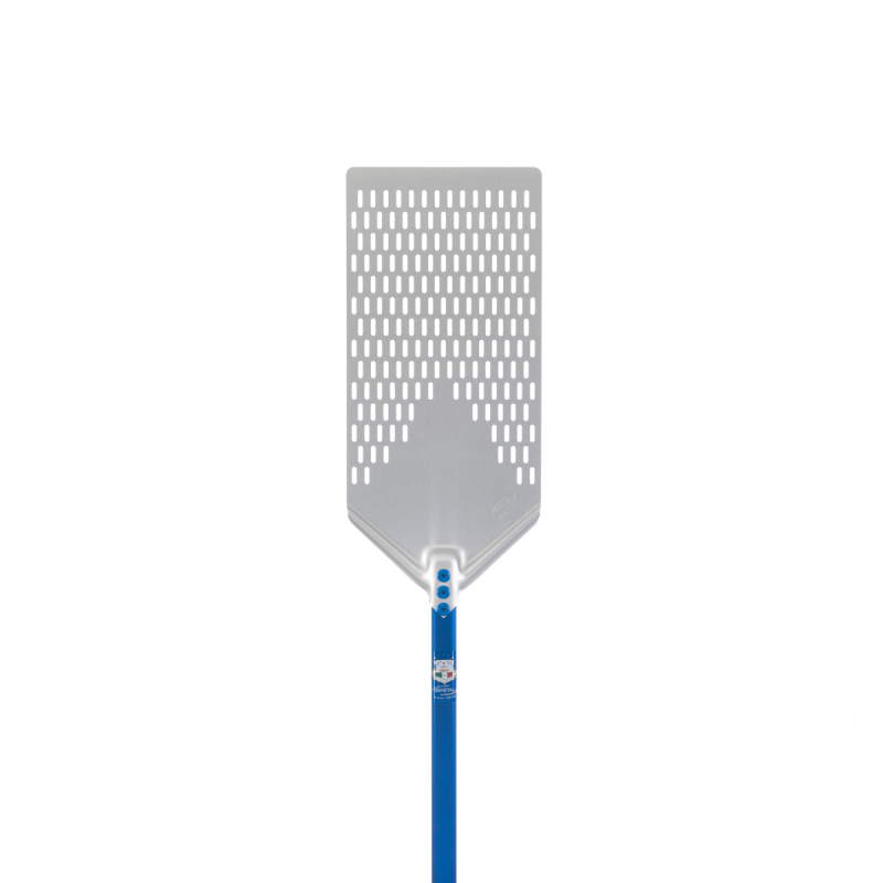 I fori riducono l'attrito, la quantità di farina in eccesso e il peso dello strumento. La speciale disposizione della foratura, rende lo strumento più stabile, soggetto ad una minore flessione, garantendo la presa in carico di pizze più pesanti.