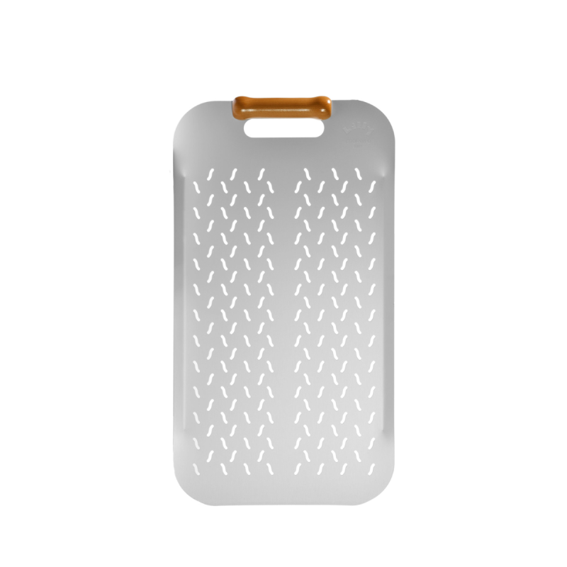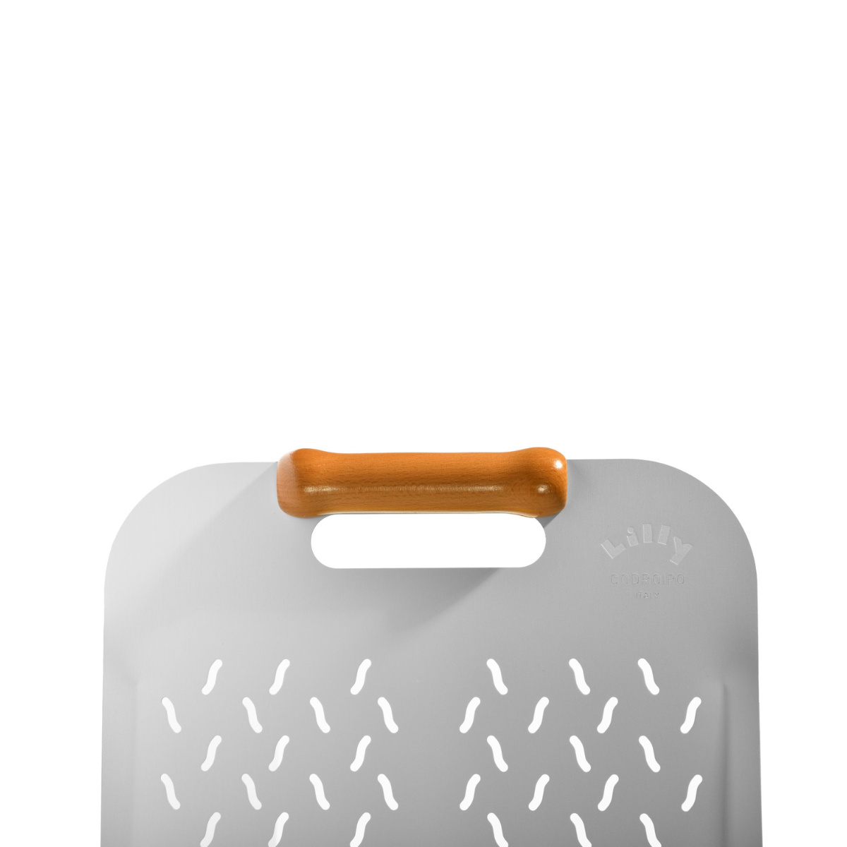 Realizzata in lega di alluminio di alta qualità, garantisce resistenza, leggerezza e ottime prestazioni anche in ambito professionale. La punta fresata facilita il caricamento della pizza, mentre i bordi laterali rialzati aiutano a mantenerla stabile, evitando cadute durante la movimentazione. Il piatto completamente forato consente di eliminare la farina in eccesso, migliorando la qualità della cottura.