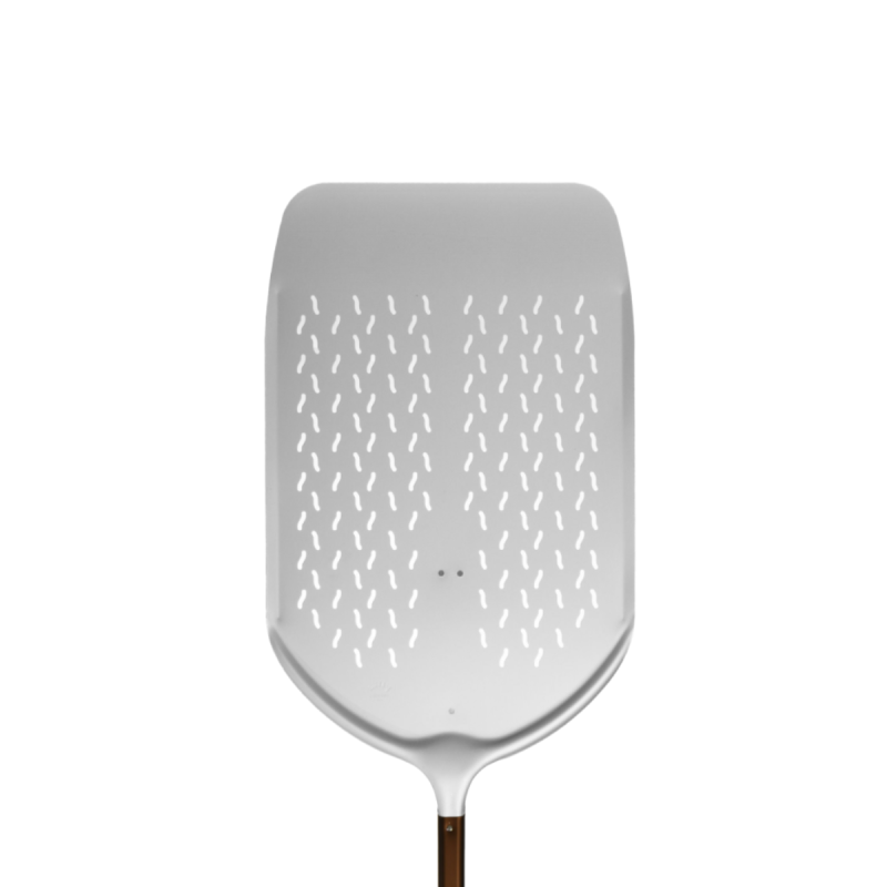 La foratura del piatto consente di eliminare efficacemente la farina in eccesso, evitando bruciature nel forno e migliorando la qualità del prodotto finale. La fresatura in punta facilita l’ingresso sotto l’impasto, rendendo le operazioni più rapide e precise.