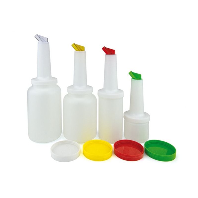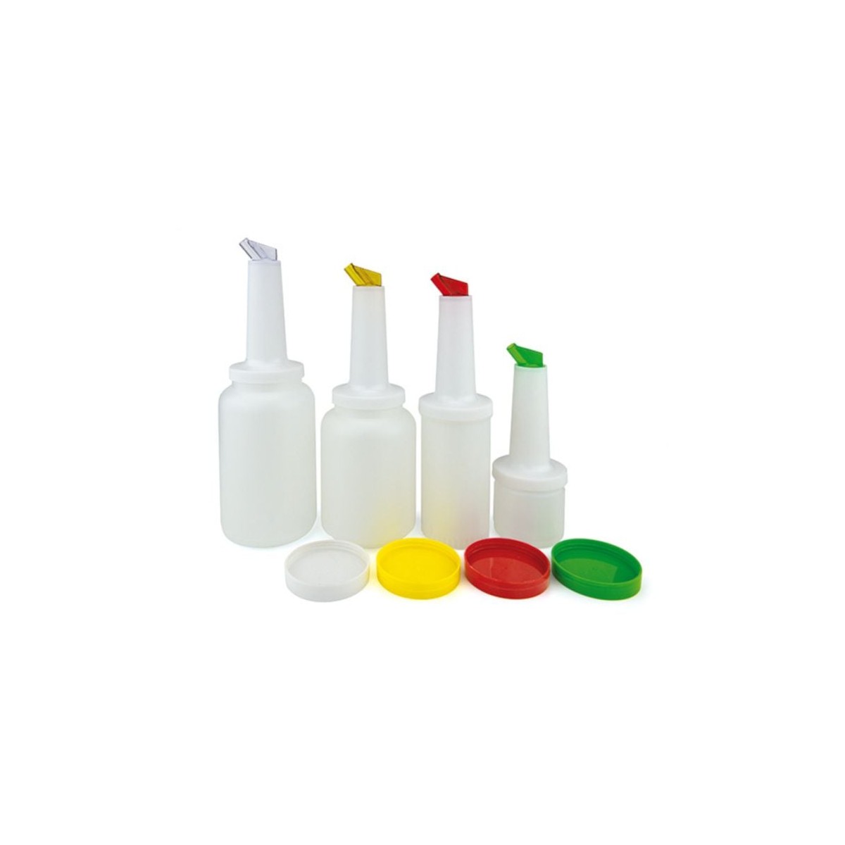 contenitori versatori per succhi da 1 L della linea Mixage, disponibile in sei colori assortiti: arancio, bianco, giallo, marrone, rosso, verde. I contenitori sono indispensabili per un servizio rapido e di precisione, possiedono una forma ergonomica studiata per il dosaggio dei succhi di frutta ed altre basi durante la preparazione dei cocktails, agevolando il lavoro del barman e del bartender. Questa tipologia di contenitore si definisce a flusso continuo ed è costituito da quattro parti: il versatore che favorisce la fuoriuscita del liquido grazie ad uno sfiato e ad un beccuccio anti sgocciolamento, la tubatura per garantire un'ottima presa, il contenitore recipiente ed il tappo che garantisce la conservazione del liquido in frigorifero. Per evitare la perdita, i coperchi sono studiati per essere fissati alla base della bottiglia. La linea Mixage è pensata appositamente per i professionisti del settore e comprende l’attrezzatura completa per realizzare cocktail.