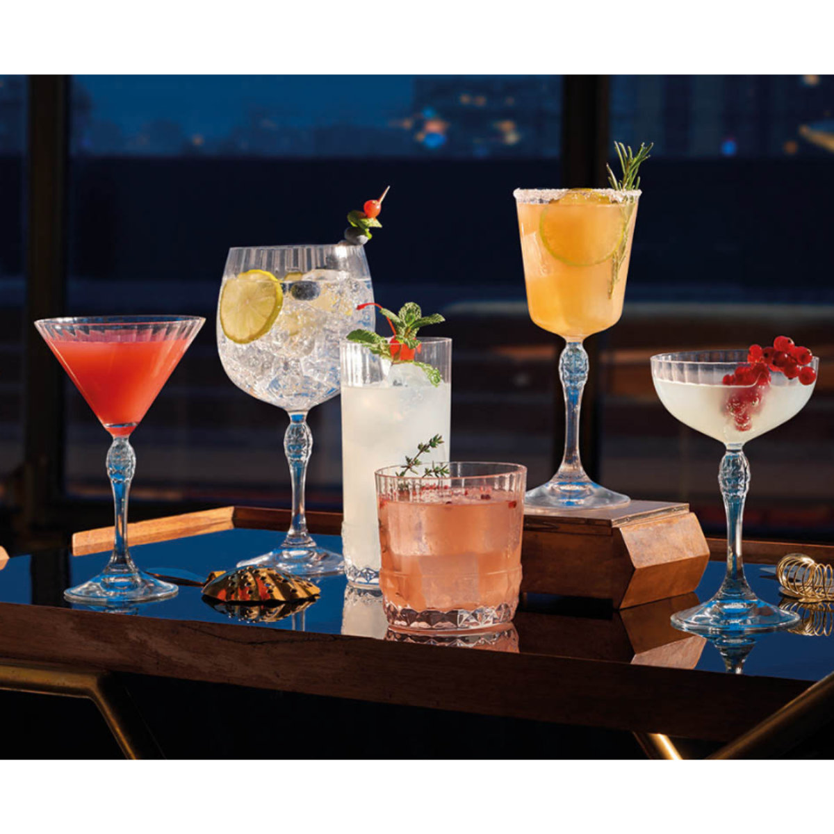 Il calice Martini della collezione America ‘20s richiama il fascino e il glamour degli anni ’20, tra cinema, charleston e speakeasy esclusivi. Lo stelo sfaccettato ricorda il taglio di un diamante, mentre la coppa ottica enfatizza i riflessi della luce, rendendo ogni cocktail un’esperienza unica.