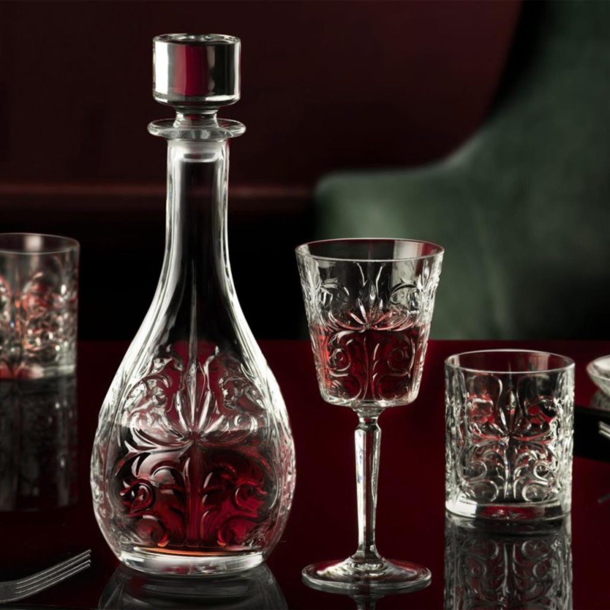 Bottiglia in vetro cristallo RCR modello Tattoo. Forma rotonda. Completa di tappo.