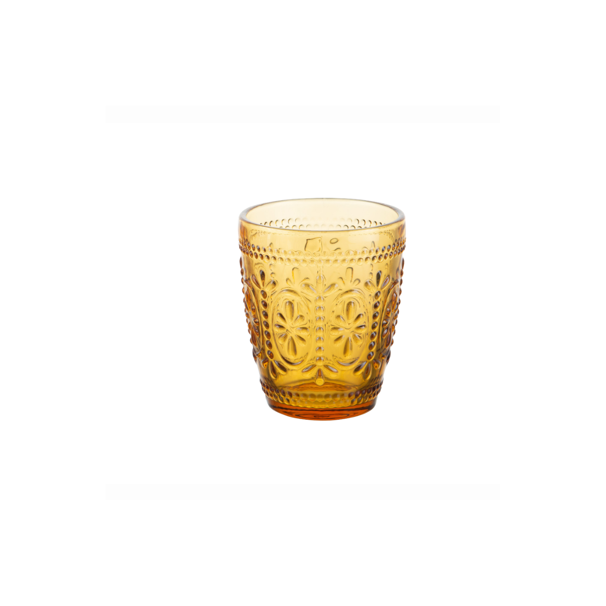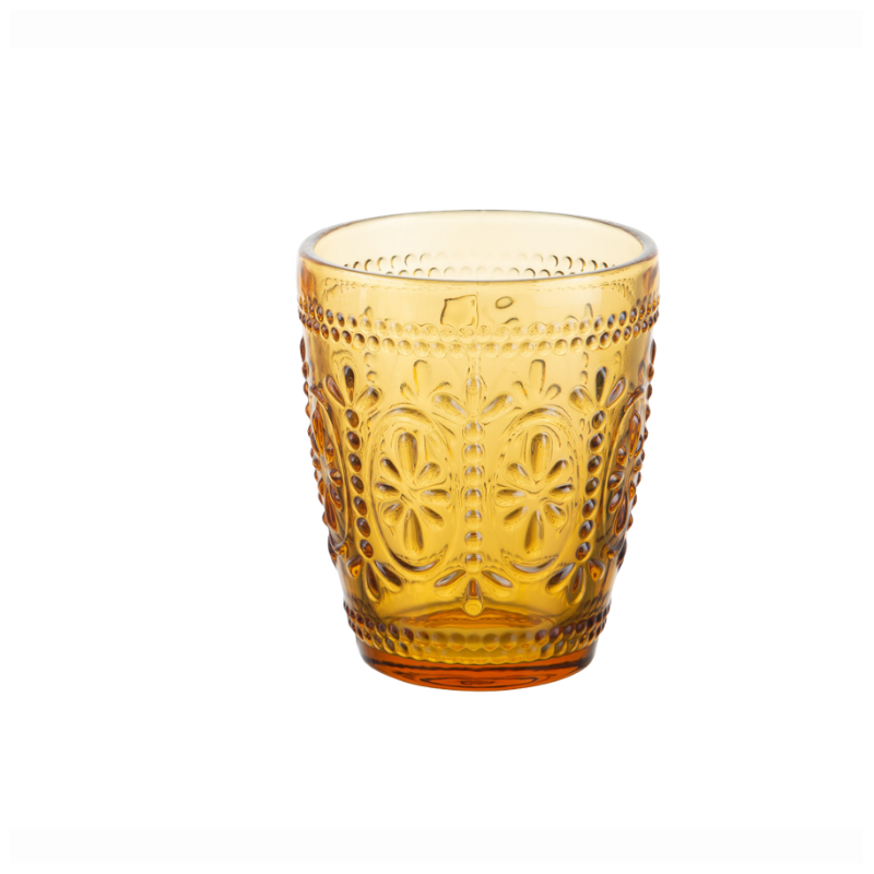 Il bicchiere acqua Baroque da 29 cl in elegante tonalità ambra è realizzato in vetro colorato in pasta e si distingue per la raffinata lavorazione a rilievo.