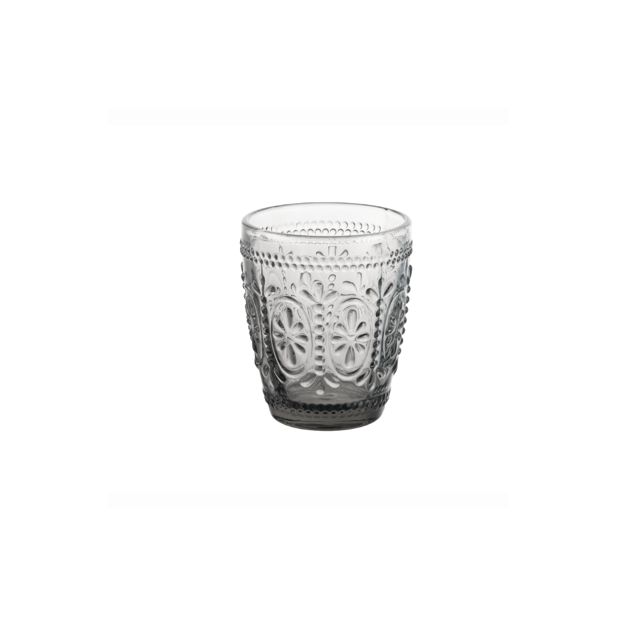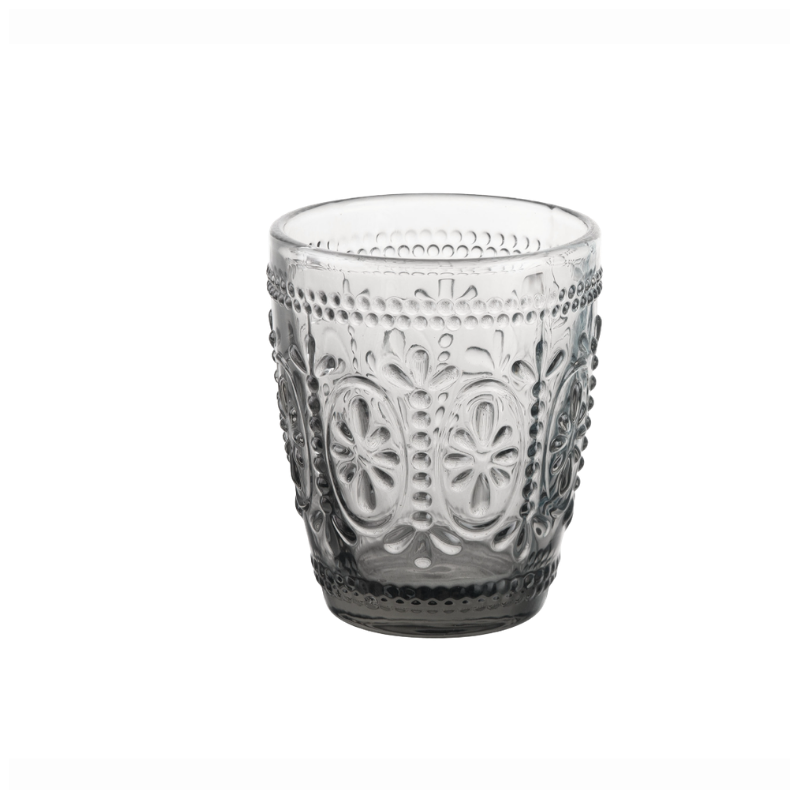 Il bicchiere acqua Baroque da 29 cl in elegante tonalità Grigia è realizzato in vetro colorato in pasta e si distingue per la raffinata lavorazione a rilievo.