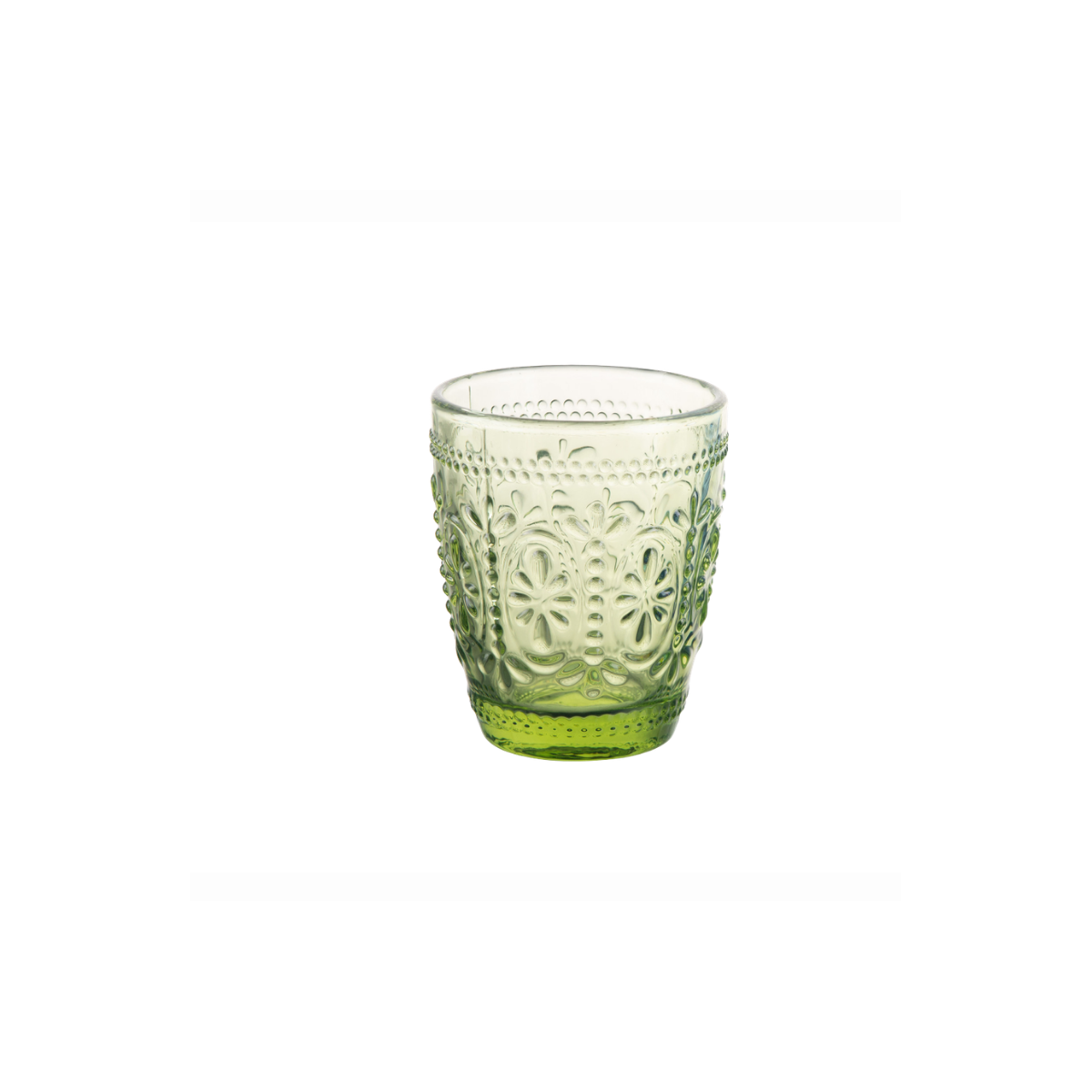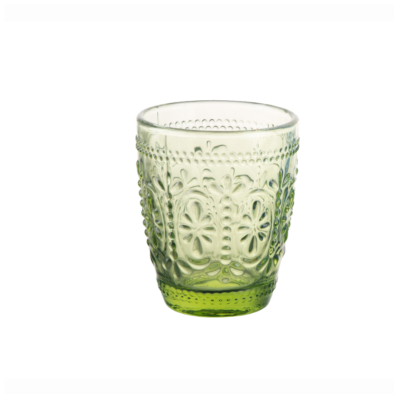 Il bicchiere acqua Baroque da 29 cl in elegante tonalità Verde è realizzato in vetro colorato in pasta e si distingue per la raffinata lavorazione a rilievo.