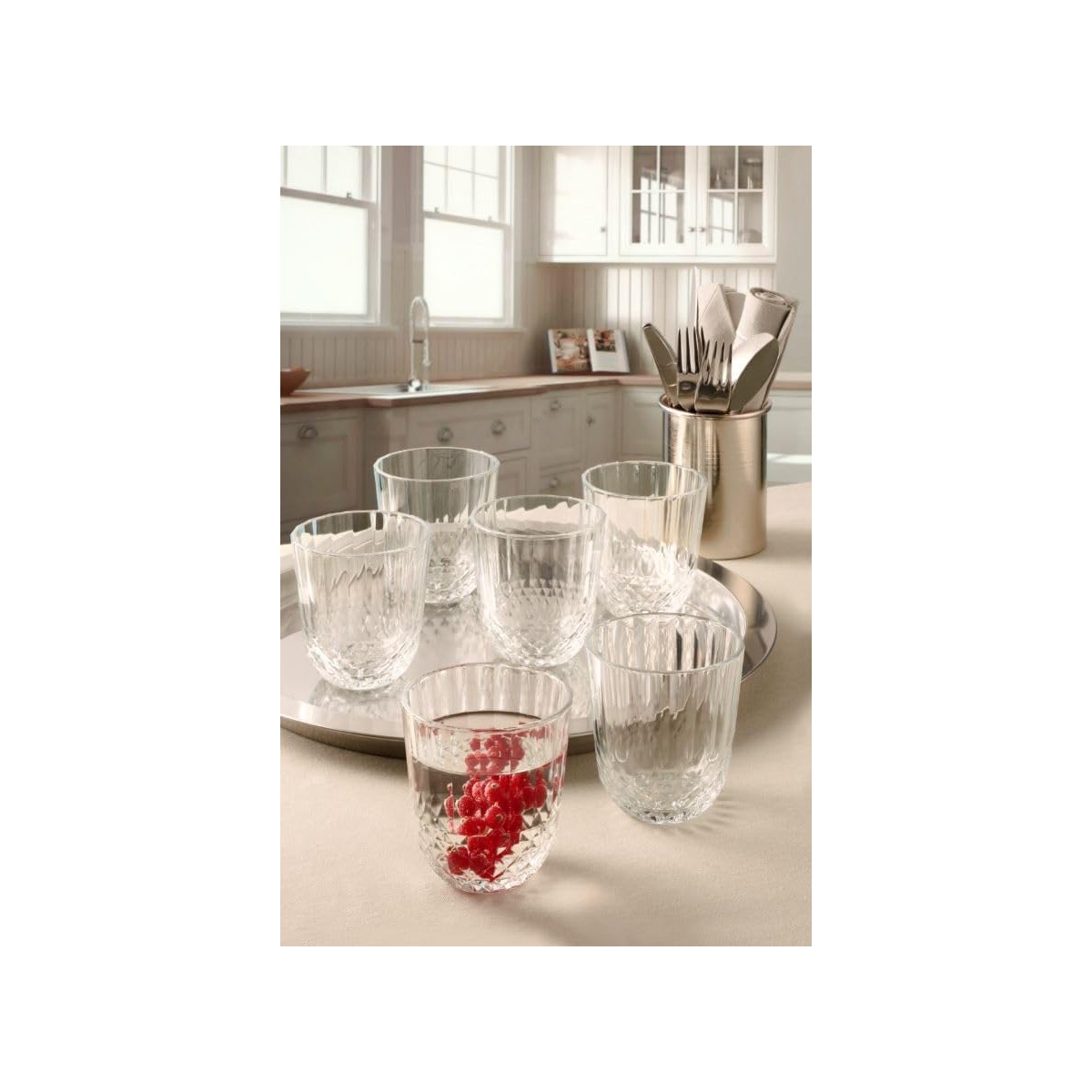 Grazie alla capacità di 32 cl, è ideale per servire acqua, bibite e succhi. Le dimensioni compatte — altezza 9,4 cm e diametro 9 cm — assicurano stabilità e una presa comoda durante l’utilizzo.