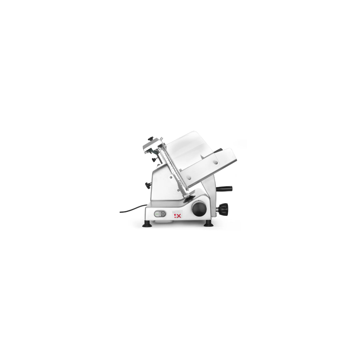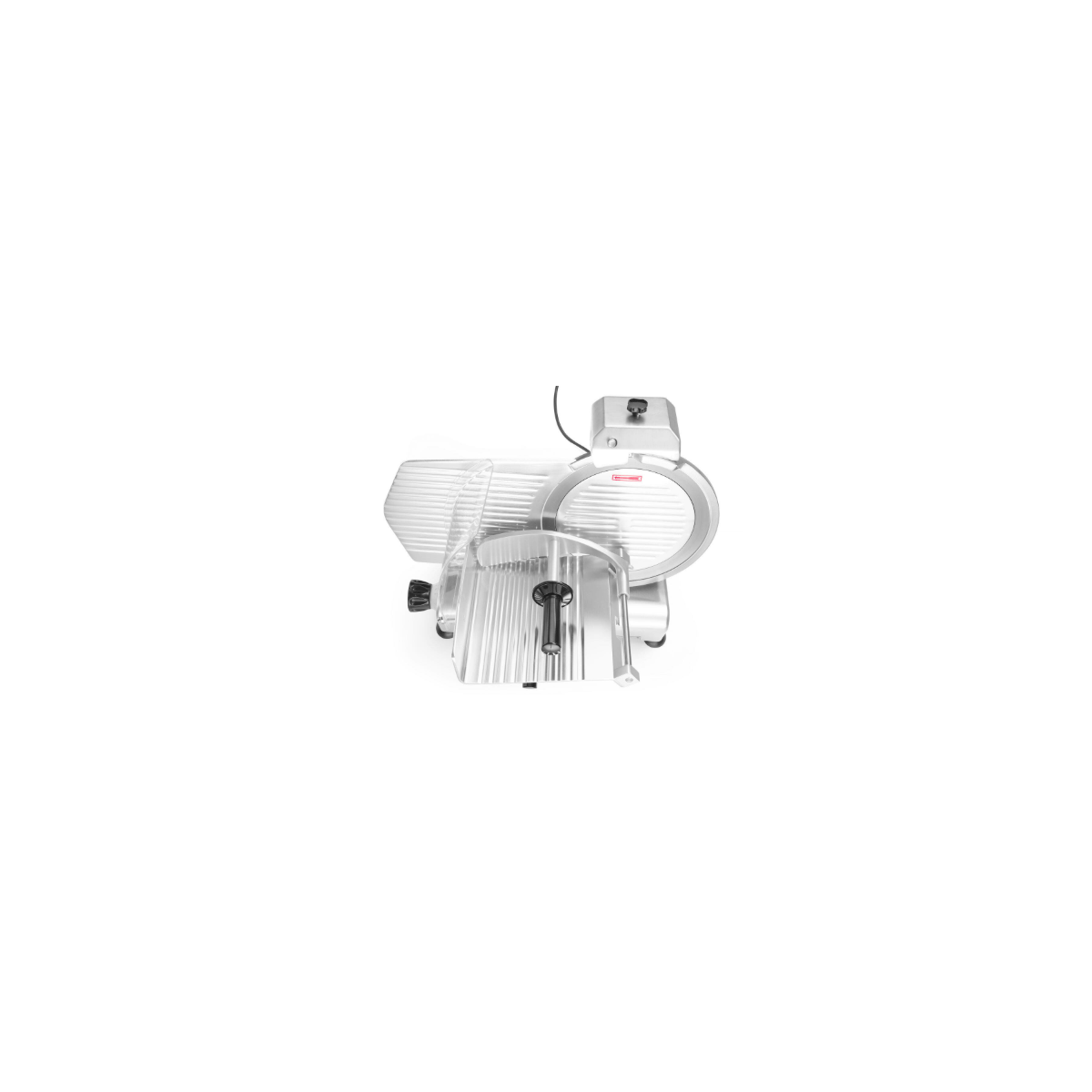 Struttura in alluminio rivestito Lama obliqua in acciaio inossidabile. Motore raffreddato ad aria con protezione anti-surriscaldamento. Motore con potenza extra elevata per il taglio di carni dure. Dotata di protezione lama e affilatrice incorporati. Carrello con schermo di sicurezza e raccogli residui con blocco verticale. Smontabile rapidamente e facilmente per le operazioni di pulizia. Conforme a tutti i requisiti di sicurezza per uso commerciale quali: - L’impostazione dello spessore a 0 mantiene la lama dietro all’apposita protezione. - La protezione dall’attivazione se la copertura dell’asse lama o dell’affilatrice non è in sede. - Il carrello può essere bloccato e rimosso esclusivamente quando la lama è impostata sullo spessore 0. Non adatto per taglio di formaggi. Lama con rivestimento speciale per tagliare formaggi o carni morbide disponibile separatamente.