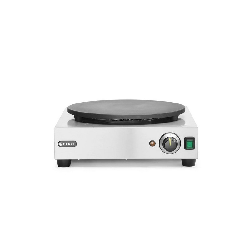 Progettato per fare crepes. Piatto di cottura Ø400 mm in ghisa con un rivestimento in ceramica. Distribuzione di calore molto uniforme su tutta la superficie. Incluso accessorio in legno. Struttura in acciaio inox. Termostato regolabile da 50 a 300°C. Con protezione da surriscaldamento e termostato EGO.