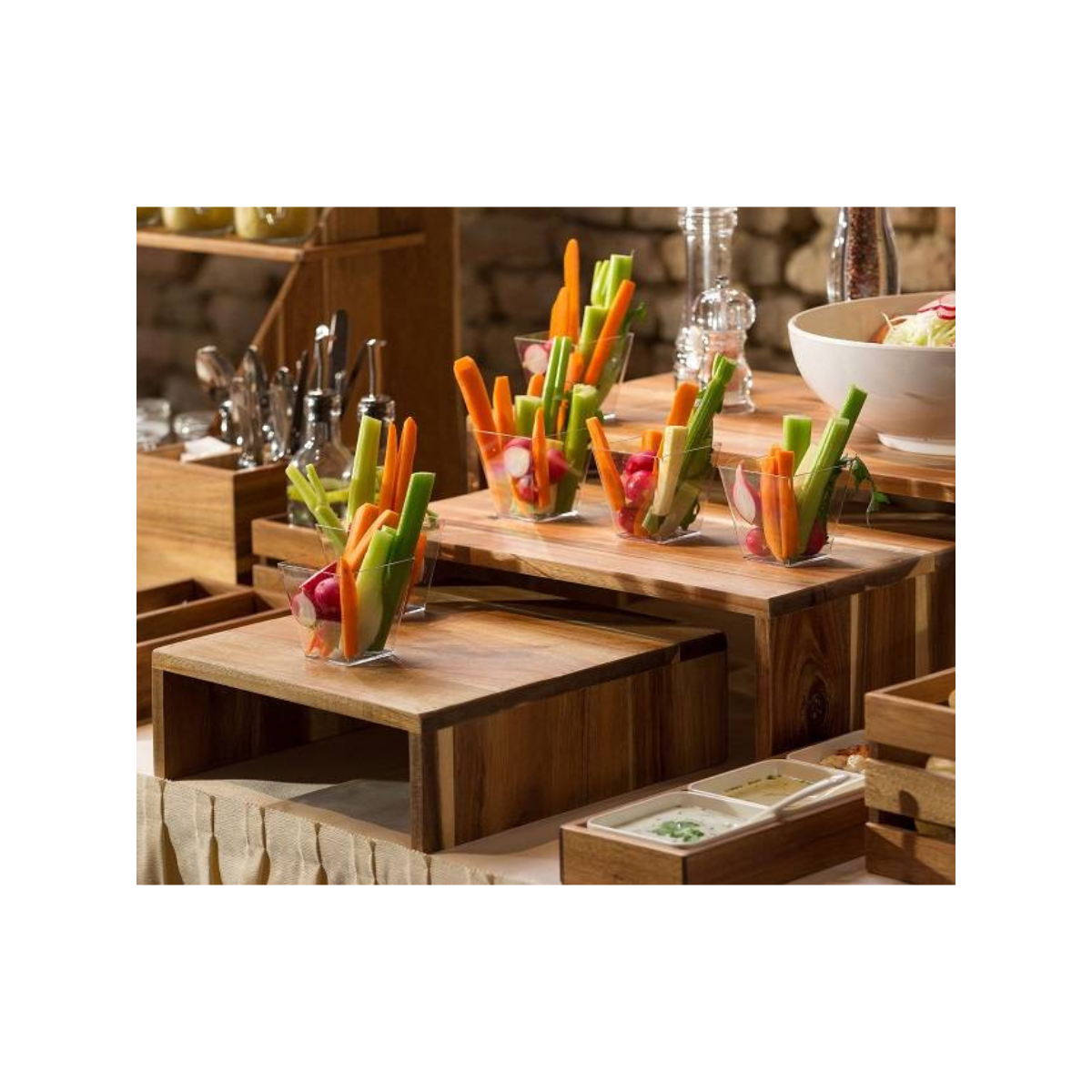 Realizzati in legno di acacia resistente, gli espositori combinano solidità, stabilità ed eleganza naturale, valorizzando la presentazione di finger food, antipasti, dolci, prodotti da forno e specialità gastronomiche.