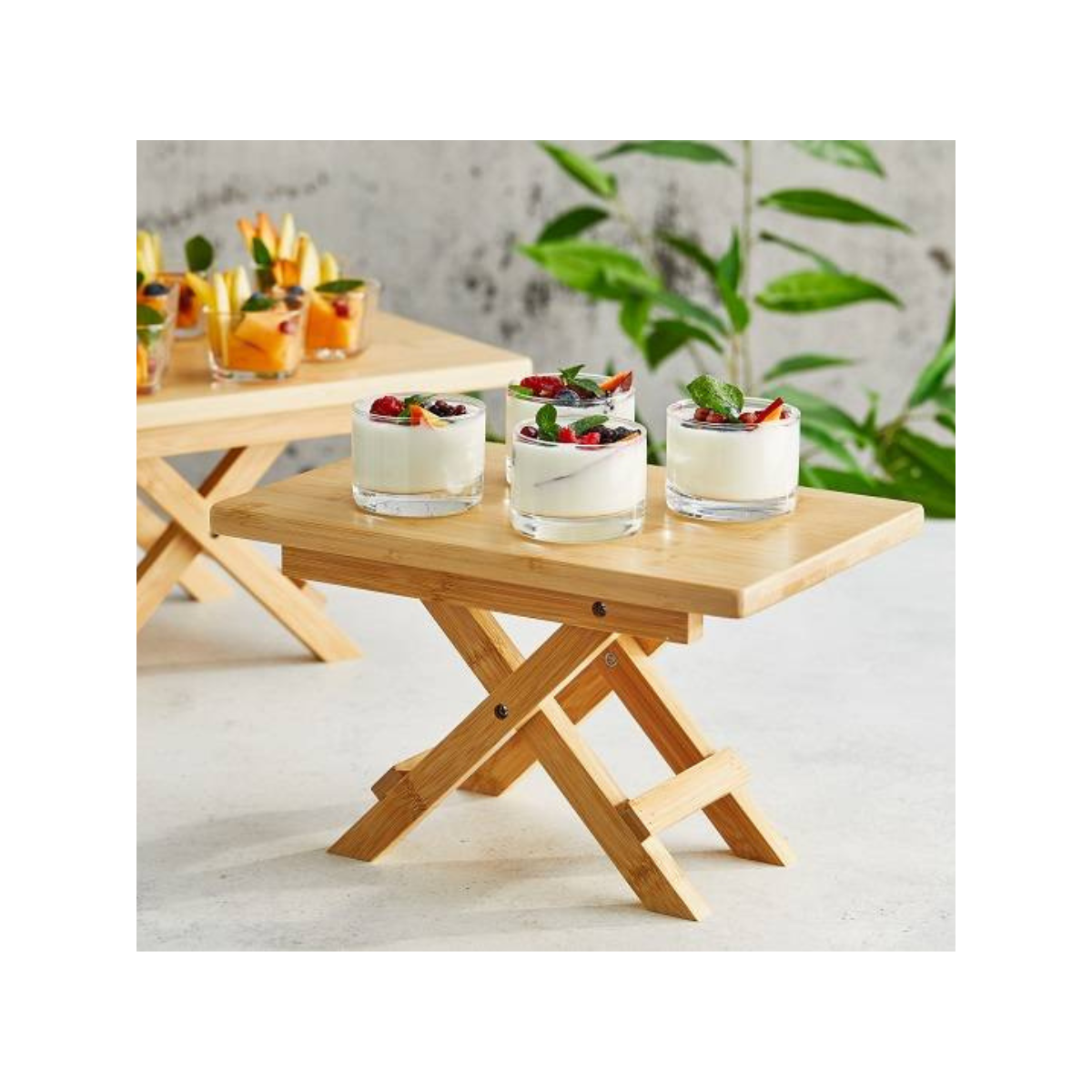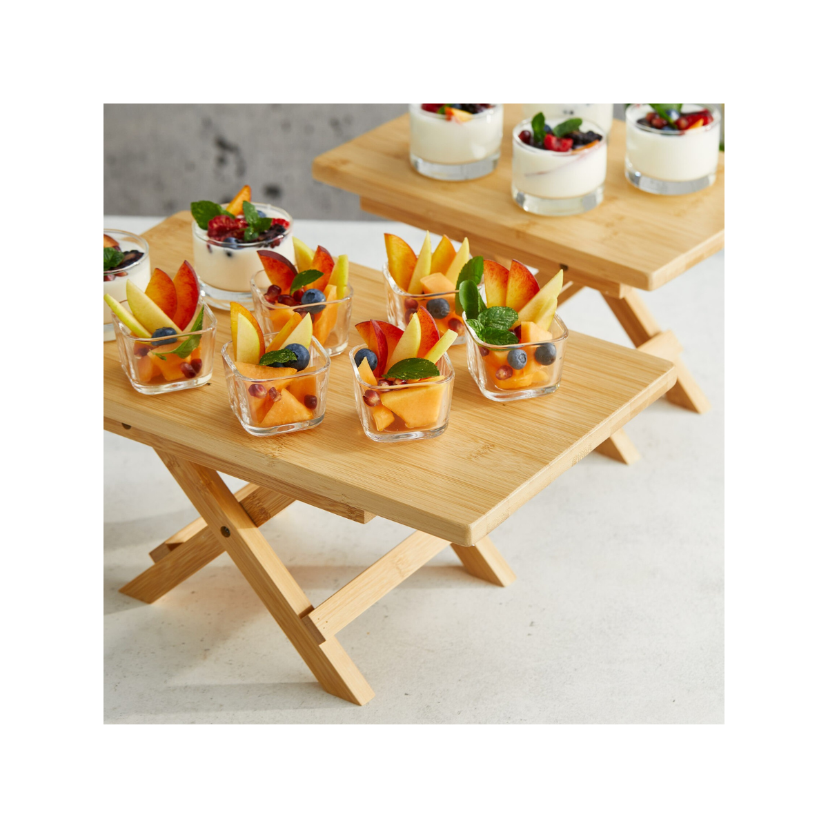 Realizzato in bamboo naturale resistente, unisce robustezza, leggerezza e un design moderno che valorizza ogni presentazione di antipasti, finger food, dolci o prodotti da forno. La sua struttura compatta e stabile permette di organizzare il buffet in modo ordinato, ottimizzando lo spazio disponibile.