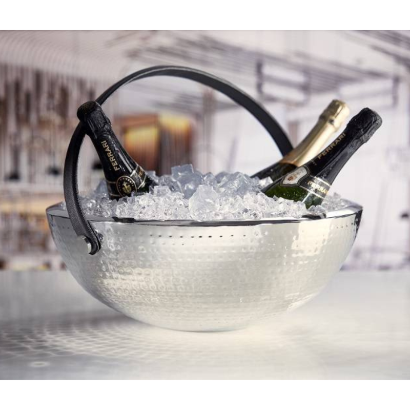 Il secchiello portaghiaccio in acciaio martellato con manico in ecopelle è un accessorio raffinato e funzionale, perfetto per il servizio di ghiaccio in bar, ristoranti, hotel, catering ed eventi.