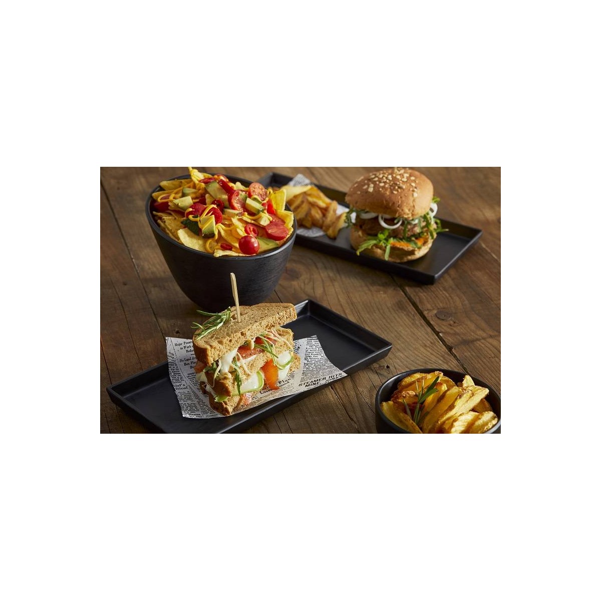 Il design con bordi inclinati valorizza l’impiattamento e dona movimento alla presentazione di insalate, poke bowl, primi piatti, zuppe e preparazioni gourmet. Il colore nero elegante crea un contrasto raffinato che esalta i colori degli alimenti.