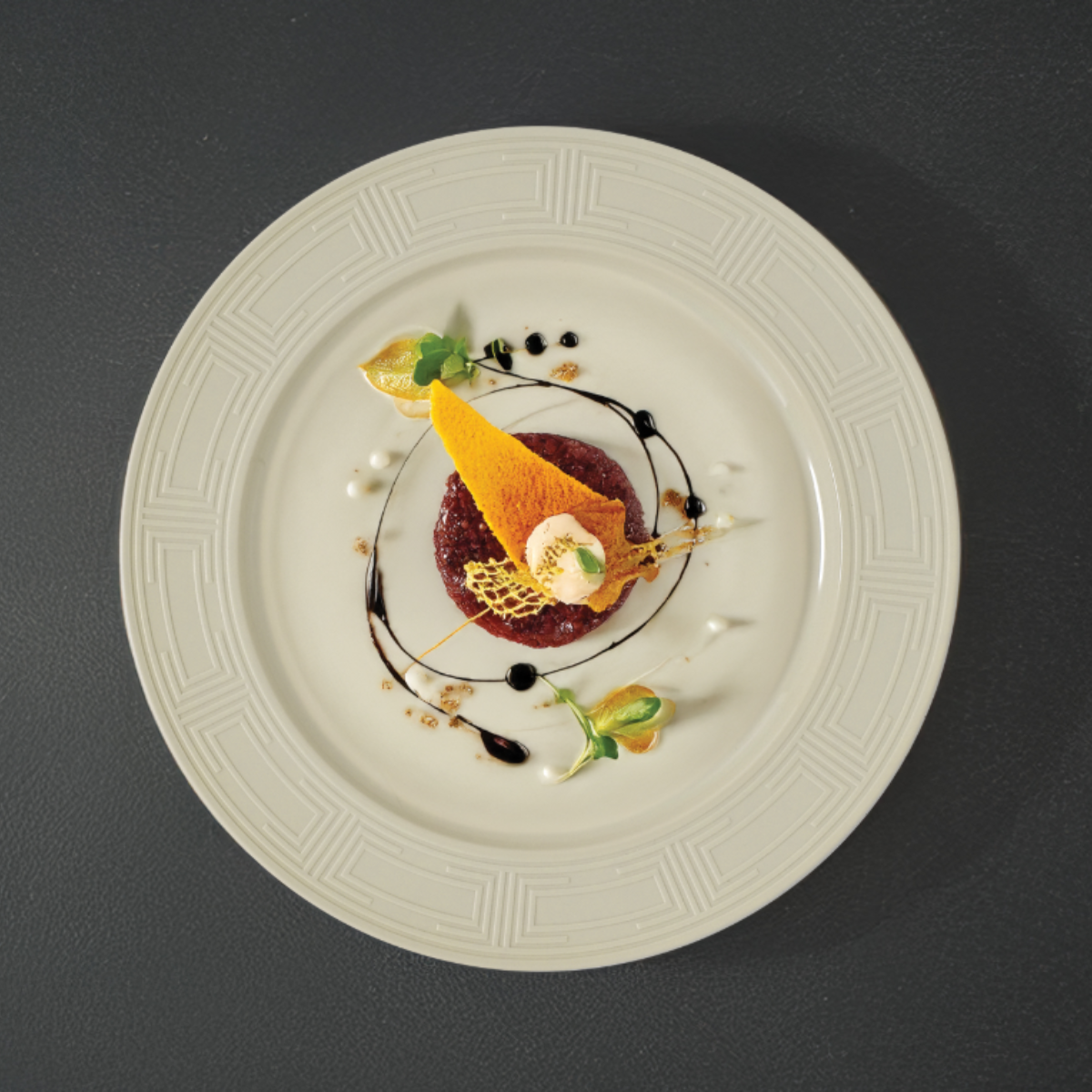 Il colore beige e il motivo Labyrinth conferiscono eleganza e modernità alla mise en place, rendendolo adatto a contesti professionali e gourmet.