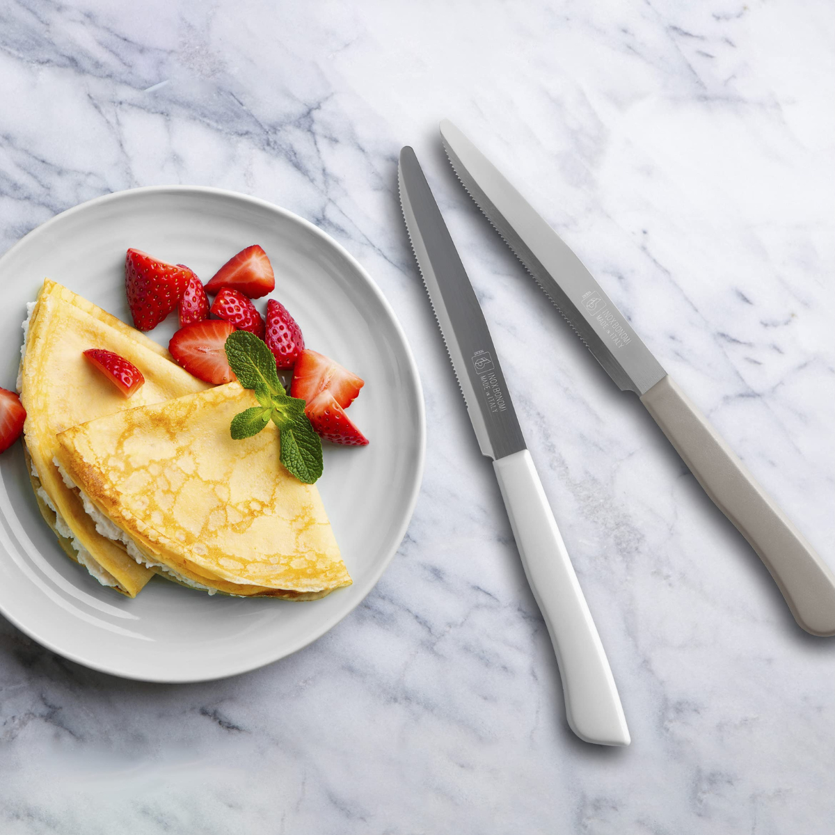 Il blister da 6 coltelli da bistecca Lux bianchi unisce eleganza e funzionalità, perfetto sia per uso professionale che domestico. Le lame in acciaio inox garantiscono tagli precisi e duraturi su bistecche e carni, mentre il manico ergonomico assicura presa sicura e comfort durante l’utilizzo.